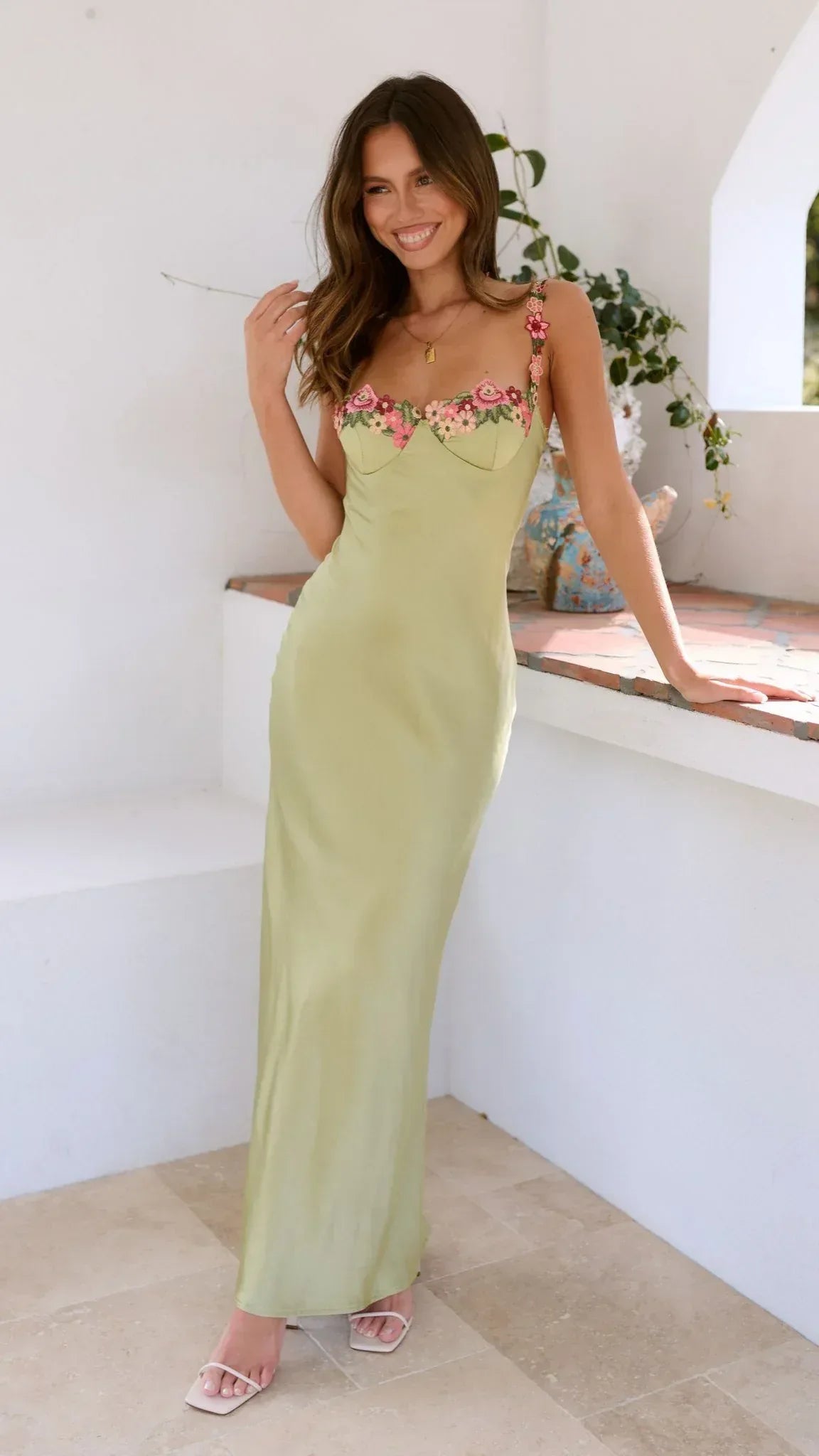 Embrace romantic elegance with Rosalie, a refined maxi designed to flatter and captivate. Featuring delicate floral embroidery along the straps and neckline, this figure-skimming silhouette blends soft femininity with modern polish. Flowing gracefully to a floor-length finish, Rosalie is the perfect choice for weddings, garden celebrations and elegant evenings.