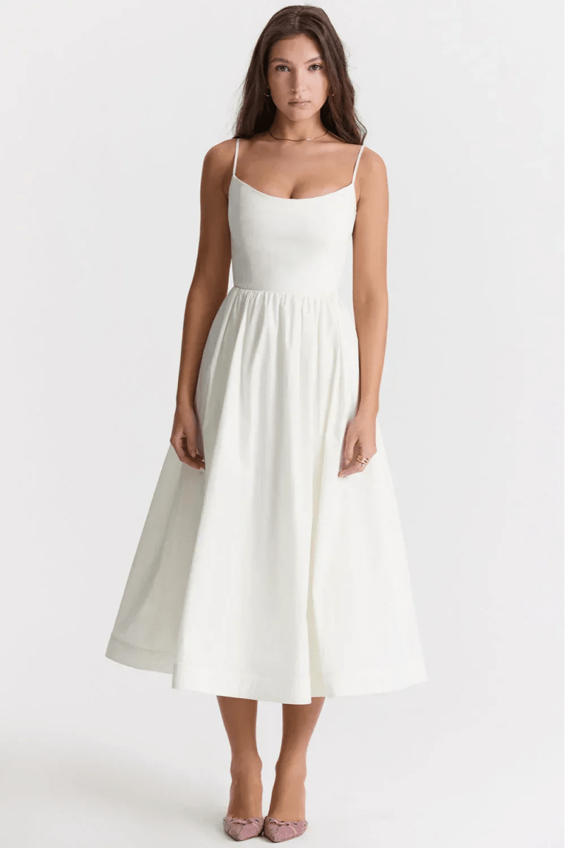 Exude effortless elegance with the Isabella Midi, a timeless silhouette designed to flatter and refine. Featuring delicate spaghetti straps and a structured square neckline, this midi dress contours through the bodice before flowing into a soft A-line skirt. Perfect for weddings, long lunches or special occasions, it offers a polished and feminine look that feels both modern and classic.