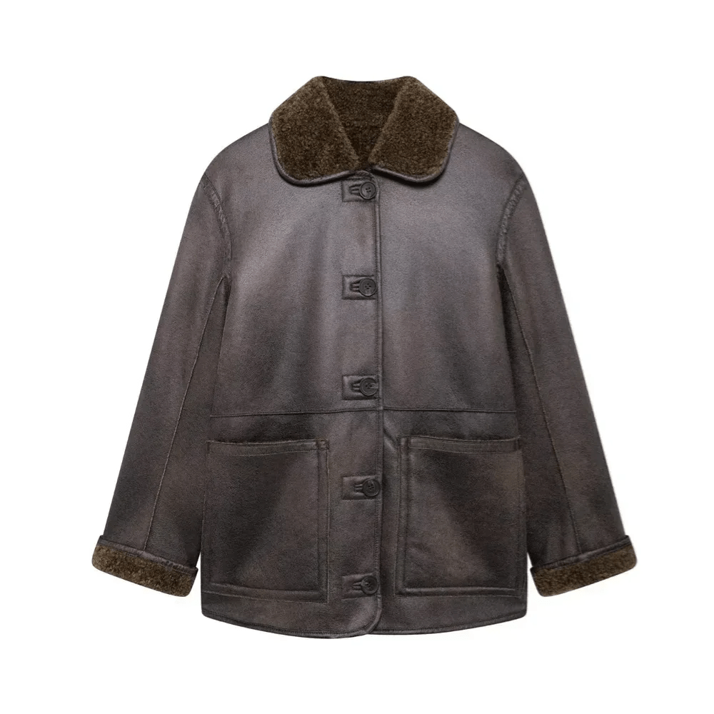 Discover effortless versatility with Maelle, a two-in-one outerwear essential designed for elevated winter styling. Featuring a reversible construction with smooth faux leather on one side and plush shearling on the other, this jacket delivers both structure and cozy texture. Vintage-inspired yet modern in silhouette, Maelle blends warmth, style and practicality seamlessly.