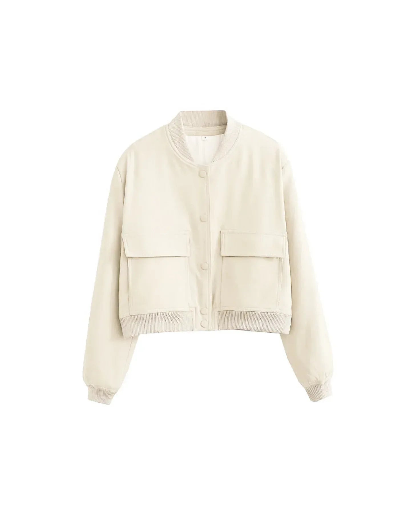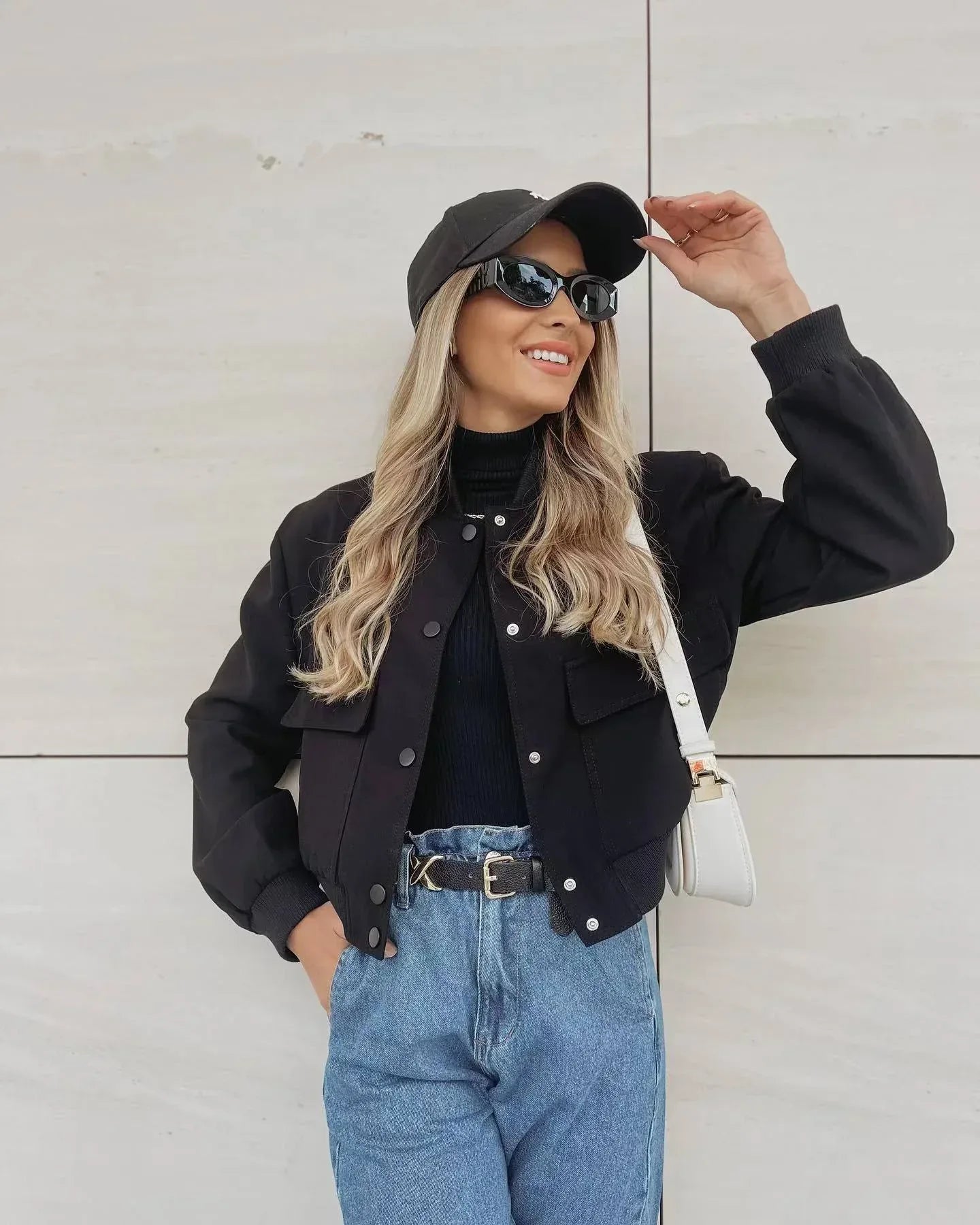 Elevate your off-duty wardrobe with Mia, a modern bomber jacket designed for effortless cool. Featuring a structured cropped silhouette and classic snap-button detailing, this piece blends relaxed styling with polished edge. Easy to layer and endlessly versatile, Mia brings contemporary refinement to everyday dressing.